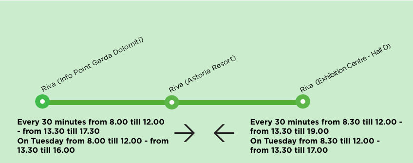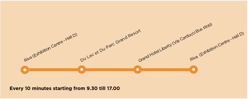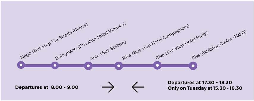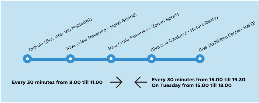 The shuttle service has been stepped up to make it easier for you to reach the fairgrounds: city shuttles to and from the centre, suburban shuttles to and from Rovereto train staition and neighbouring areas (Nago-Arco-Torbole-Riva) and dedicated shuttles between the fairgrounds and the hotels hosting the show. No reservation needed.